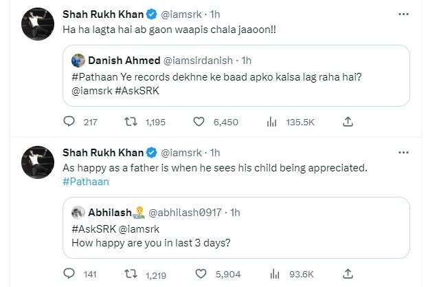 ‘पठाण’च्या यशानंतर शाहरुखने #AskSRK ट्विटर सेशन घेतलं. या सेशनद्वारे चाहत्यांनी त्याला अनेक प्रश्न विचारले. या प्रश्नांची शाहरुखने अगदी दिलखुलासपणे उत्तरं दिली. शिवाय ‘पठाण’ची रेकॉर्डब्रेक कमाई पाहून शाहरुख खूश असल्याचंही यावेळी दिसून आलं. त्याला चाहत्यांनी ‘पठाण’साठी शुभेच्छाही दिल्या.