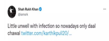 यावेळी शाहरुख म्हणाला, “इन्फेक्शनमुळे सध्या तब्येत ठिक नाही. म्हणूनच मी फक्त डाळ-भात खात आहे.” शाहरुखने सध्या तब्येतीमुळे त्याच्या डाएटमध्ये बदल केला असल्याचं दिसत आहे. पण शाहरुखला इन्फेक्शन कशामुळे झालं आहे हे अद्याप स्पष्ट झालेलं नाही.