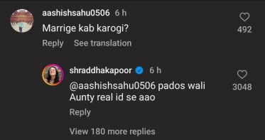 काही दिवसांपूर्वीच श्रद्धाच्या एका फोटोवर एका चाहत्याने कमेंट करत लग्न कधी करणार? असा प्रश्न विचारला होता. त्याला श्रद्धाने अगदी हजरजबाबीपणे उत्तर दिलं होत. श्रद्धाने उत्तर देत लिहिलं होतं “पडोस वाली आंटी रियल आयडी से आओ.”श्रद्धाने दिलेलं हे जबरदस्त उत्तर चांगलंच चर्चेत आलं आहे.