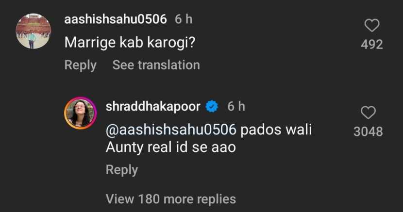 श्रद्धाने नुकतेच सोशल मीडियावर तिचे दोन फोटो शेअर केले. यामध्ये ती वनपिस घालून फोटोसाठी पोज देताना दिसत आहे. तिच्या या फोटोंवर तिच्या चाहत्यांनी विविध प्रतिक्रिया देत तिचा हा अंदाज आवडल्याचं सांगितलं. तर एका चाहत्याने कमेंट करत तिला विचारलं, “लग्न कधी करणार?” चाहत्याच्या या प्रश्नाला उत्तर देत श्रद्धाने लिहिलं, “पडोस वाली आंटी रियल आयडी से आओ.”