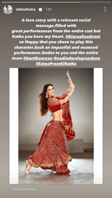 सिद्धार्थ मल्होत्राने इन्स्टाग्राम स्टोरी शेअर करीत आपल्या बायकोचे कौतुक केले आहे. कियाराचा ‘सत्यप्रेम की कथा’ चित्रपटातील एक फोटो शेअर करीत सिद्धार्थ कॅप्शनमध्ये लिहितो की, “चित्रपटात एक सुंदर सामाजिक संदेश देण्याचा प्रयत्न केला आहे. यामध्ये प्रत्येक कलाकाराने उत्तम अभिनय केला असून ‘कथा’ या पात्राने माझे विशेष मन जिंकले आहे. कियारा, ‘कथा’ ही भूमिका तू निवडलीस म्हणून मी अत्यंत आनंदी असून, या चित्रपटातील तुझा अभिनय अतिशय प्रभावशाली आहे. कियारा अडवाणी, कार्तिक आर्यन आणि चित्रपटाच्या संपूर्ण टीमला माझ्याकडून खूप खूप शुभेच्छा…”