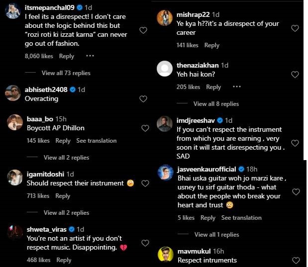 एपी ढिल्लोंच्या या व्हायरल व्हिडीओवर एका नेटकरीने लिहिलं आहे, “मला हे अपमानजनक वाटतं आहे. अशी कृती करण्यामागचं नेमकं कारण माहित नाही. पण रोजी रोटीची इज्जत करणं, ही कधी फॅशन होऊ शकत नाही.” दुसऱ्या नेटकऱ्याने लिहिलं आहे, “बॉयकॉट एपी ढिल्लों.” तसेच तिसऱ्या नेटकऱ्याने लिहिलं आहे, “तुम्ही संगीताचा आदर करत नसाल तर तुम्ही कलाकार नाही. निराशाजनक.” तर चौथ्या नेटकऱ्याने लिहिलं आहे, “तुम्ही ज्या साधनांचा वापर करून कमाई करत आहात त्या साधनांचा तुम्ही आदर करू शकत नसालं तर लवकरच ते साधन तुमचा अनादर करू लागेल.”