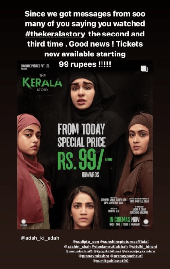 ‘द केरला स्टोरी’ चित्रपटाला मिळालेल्या यशानंतर निर्मात्यांनी महत्त्वपूर्ण निर्णय घेतला आहे. या संदर्भात अभिनेत्री अदा शर्मा हिने पोस्ट शेअर करत माहिती दिली आहे. अदाने लिहिले आहे, “चित्रपट रिलीज होऊन आज ५ आठवडे पूर्ण झाले आहेत. अनेक जण मला मेसेज करत असतात. आम्ही २ ते ३ वेळा हा चित्रपट पाहिला. चित्रपटाला मिळणारा भरघोस प्रतिसाद पाहून आमच्या प्रेक्षकांसाठी आम्ही महत्त्वपूर्ण निर्णय घेत तिकिटाचे दर ९९ रुपये केले आहेत.” प्रेक्षकांना ६ जूनपासून हा चित्रपट फक्त ९९ रुपयांमध्ये पाहता येणार आहे, ही ऑफर आता सर्व सिनेमागृहांमध्ये लागू झालेली आहे. या सिनेमाने भारतात २३७.६२ कोटी, तर जगभरात २९२ कोटींचा गल्ला जमवला आहे.