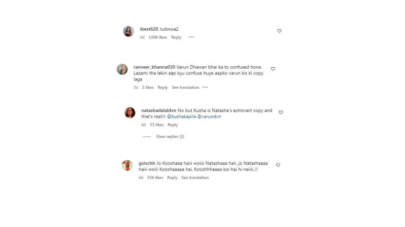 कुशाने या व्हिडीमध्ये असंख्य युजर्सच्या “नताशा आणि तू सारखी दिसतेस…” सांगणाऱ्या कमेंट्सचे स्क्रिनशॉट्स जोडले आहेत. यामध्ये अनेक युजर्स तिला “नताशा दलालची हुबेहूब कॉपी”, “जुडवा २ इन रिअल लाईफ” असे म्हणत आहेत. व्हिडीओ शेअर करताना कॅप्शनमध्ये नमूद करत कुशाने वरुण धवनचे आभार मानले आहेत. कुशाने शेअर केलेला हा व्हिडीओ सध्या सोशल मीडियावर प्रचंड व्हायरल होत आहे.