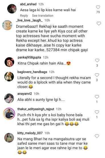 पण या व्हिडीओमुळे रेखा आणि आलिया ट्रोल झाले आहेत. या व्हिडीओत आलिया आणि रेखा हे एकमेकांच्या तोंडासमोर आल्याने अनेकांनी त्यांना ट्रोल केले आहे. हा व्हिडीओ पाहून एक नेटकरी म्हणाला, “असं वाटलं की लिप किस करणार आहेत.” तर एकाने म्हटले की “आलिया किती चिपकते आहे.” तर एकाने “ना सिंदूर लावलं आहे, ना मंगळसूत्र. त्यावर पांढऱ्या रंगाची साडी परिधान केली आहे. असं मी केलं असते तर माझ्या सासूने मला टोमणे मारले असते”, अशी कमेंट केली आहे.