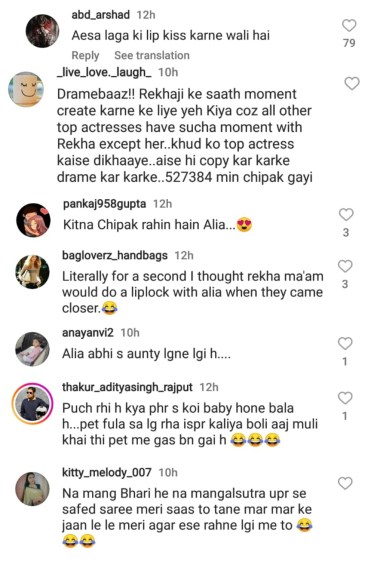 पण या व्हिडीओमुळे रेखा आणि आलिया ट्रोल झाले आहेत. या व्हिडीओत आलिया आणि रेखा हे एकमेकांच्या तोंडासमोर आल्याने अनेकांनी त्यांना ट्रोल केले आहे. हा व्हिडीओ पाहून एक नेटकरी म्हणाला, “असं वाटलं की लिप किस करणार आहेत.” तर एकाने म्हटले की “आलिया किती चिपकते आहे.” तर एकाने “ना सिंदूर लावलं आहे, ना मंगळसूत्र. त्यावर पांढऱ्या रंगाची साडी परिधान केली आहे. असं मी केलं असते तर माझ्या सासूने मला टोमणे मारले असते”, अशी कमेंट केली आहे.