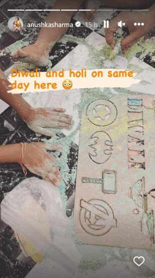 विराट सध्या टी-२० वर्ल्ड कप खेळण्यासाठी ऑस्ट्रेलियामध्ये आहे. त्यामुळे अनुष्का वामिकसह दिवाळी साजरी करत आहे. अनुष्काने तिच्या इन्स्टाग्राम स्टोरीमध्ये दिवाळी सेलिब्रेशनचे फोटो शेअर केले आहेत. यात तिने वामिकाचाही एक फोटो शेअर केला आहे. दिवाळीसाठी रांगोळी काढतानाचा हा फोटो आहे. रांगोळीच्या रंगाबरोबर वामिका खेळताना दिसत आहे. या फोटोला अनुष्काने “दिवाळी आणि होळी इथे एकाच दिवशी साजरी होत आहे”, असं कॅप्शन दिलं आहे.