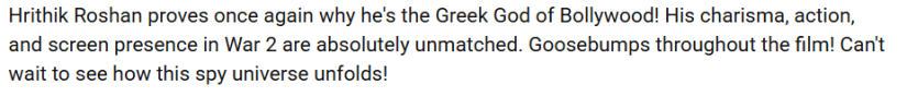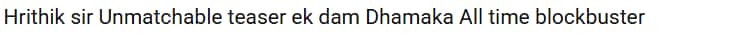 अनेकांनी हा टीझर उत्सुकता वाढविणारा असल्याचे म्हटले आहे. टीझरमधील हृतिक रोशनच्या लूकने प्रेक्षकांना भुरळ पडल्याचे कमेंट्समधून दिसत आहे. तसेच चाहत्यांनी ज्युनियर एनटीआरला वाढदिवसाच्या शुभेच्छा दिल्या आहेत. लोकप्रिय अभिनेता ज्युनियर एनटीआर आज ४१ वा वाढदिवस साजरा करीत आहे.