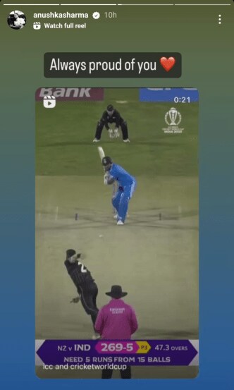 अभिनेत्री अनुष्का शर्मा भारत विरुद्ध न्यूझीलंड मॅच पाहण्यासाठी मैदानावर उपस्थित नव्हती. परंतु, आपल्या पतीच्या कामगिरीचं कौतुक करण्यासाठी आणि त्याचं मनोबल वाढवण्यासाठी अनुष्काने आयसीसीच्या सोशल मीडिया पेजवरील एक व्हिडीओ शेअर केला आहे. हा व्हिडीओ विराट ९५ धावांवर झेलबाद होतानाचा आहे. तो व्हिडीओ शेअर करुन अनुष्काने कॅप्शनमध्ये “मला तुझा कायम अभिमान वाटतो”, असं लिहिलं आहे. तसेच दुसऱ्या एका पोस्टमध्ये अनुष्काने विराटला वादळाचा पाठलाग करणारा (स्टॉर्म चेसर) असं म्हटलं आहे.