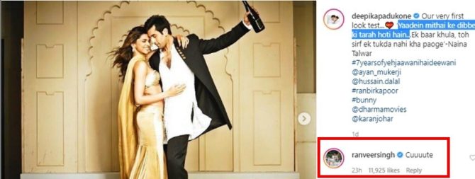 ‘ये जवानी है दिवानी’ या चित्रपटामध्ये दीपिका आणि रणबीरने एकत्र स्क्रीन शेअर केली होती. हा चित्रपट तुफान लोकप्रिय झाला होता. विशेष म्हणजे या चित्रपटाच्या पहिल्या लूक टेस्टचा फोटो दीपिकाने शेअर केला आहे. तसंच तिने या चित्रपटातील ‘यादें मिठाई के डिब्बे की तरह होती है..एक बार खुला तो सिर्फ एक टुकड़ा नहीं खा पाओगे- नैना तलवार।’, हा डायलॉग कॅप्शनमध्ये दिला आहे. हा फोटो पाहिल्यानंतर रणवीर सिंगने त्यावर ‘क्युट’ अशी कमेंट केली आहे.
