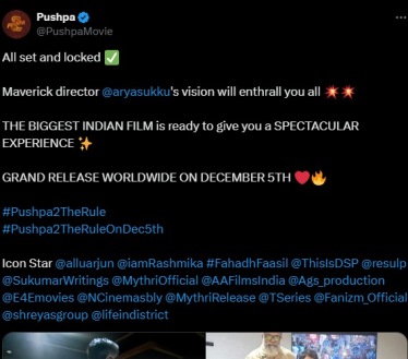 निर्मात्यांनी हे फोटो पोस्ट करत यावर कॅप्शनमध्ये लिहिलं की, “सर्व तयारी झाली आहे, सुकुमार यांच्या दिग्दर्शनातील हा चित्रपट तुम्हाला रोमांचक अनुभव नक्की देईल. सर्वात मोठा भारतीय चित्रपट तुम्हाला एक छान अनुभव देण्यासाठी पूर्णत: तयार झाला आहे. ५ डिसेंबरला चित्रपट सर्वत्र प्रदर्शित होईल.”
