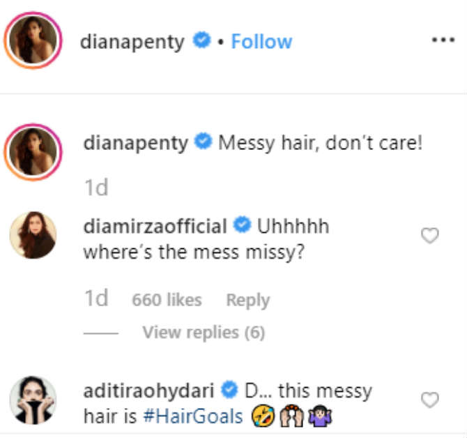 ‘डी…असे विस्कटलेले केस अनेकांचं स्वप्न आहे’, असं अदिती राव हैदरीने कमेंट केली. तर ‘उह.. विस्कटलेले केस कुठे आहेत?’, असं दियाने म्हटलं.