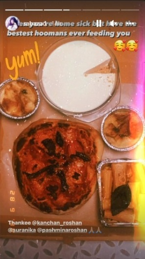 काही दिवसांपासून सबा आझाद आजारी आहे. अशात हृतिक आणि त्याचे कुटुंबीय काळजी घेत आहेत. हृतिकच्या कुटुंबीयांनी सबासाठी जेवण पाठवलं होतं. ज्याचे फोटो सबानं तिच्या इन्स्टाग्राम स्टोरीवर शेअर केले आहेत. फोटो शेअर करताना तिनं लिहिलं, ‘जेव्हा तुम्ही आजारी असता. तेव्हा तुम्हाला जेवण देण्यासाठी बेस्ट माणसं असतात.’ या आपल्या पोस्टमध्ये सबानं कंचन रोशन, पशमीना रोशन यांना टॅग केलं आहे.