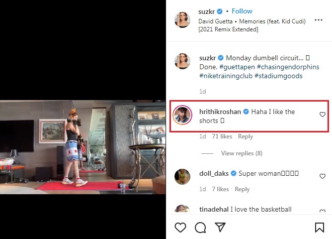 सुझाननं तिच्या इन्स्टाग्रामवर वर्कआउटचा व्हिडीओ शेअर केला आहे. ज्यात ती डंबल्स उचलताना दिसत आहे. वर्कआउट करताना तिने टॅन्क टॉप आणि बास्केटबॉल शॉर्ट्स घातल्या आहे. तिच्या या प्रिटेंड शॉर्ट्स पाहून हृतिकला हसू अनावर झालं. तिच्या व्हिडीओवर कमेंट करताना हृतिकनं लिहिलं, ‘हाहाहा… मला या शॉर्ट्स आवडल्या.’ तसं पाहायला गेलं तर अशाप्रकारची कमेंट करण्याची हृतिकची ही पहिलीच वेळ नाही. त्यानं याआधी कुणाल कपूरच्या वाढदिवशी त्याच्या शॉर्ट्सवरून कमेंट करत त्याची खिल्ली उडवली होती.