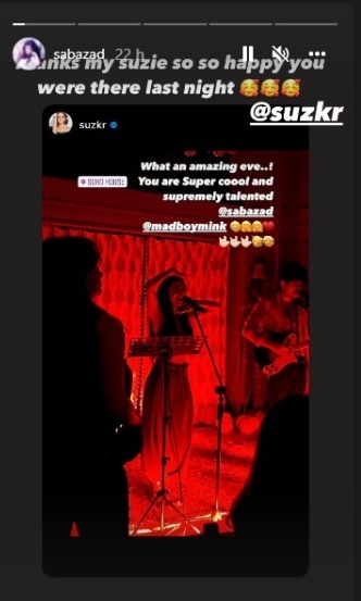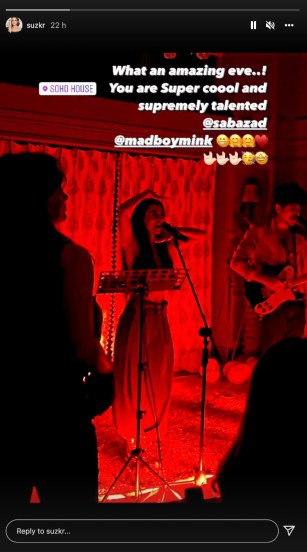 सुझानने तिच्या इन्स्टाग्राम अकाऊंटवरून हा फोटो शेअर केला आहे. हा फोटो मुंबईतील एका कॉन्सर्टमधला आहे. हा फोटो शेअर करत ‘सबा तू एक सुंदर संध्याकाळ! तू सुपर कूल आहेस आणि अत्यंत प्रतिभावान आहेस,’ असे कॅप्शन सुझानने दिले आहे. सुझानची ही पोस्ट शेअर करत सबा सुझानला उत्तर देत म्हणाली ‘धन्यवाद सुझी, तू काल तिथे होतीस याचा मला आनंद आहे.’