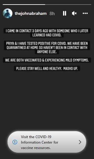 सोशल मीडियावर पोस्ट शेअर करताना जॉननं लिहिलं, ‘३ दिवसांपूर्वी मी एका व्यक्तीच्या संपर्कात आलो होतो. मला नंतर समजलं की ती व्यक्ती करोना पॉझिटिव्ह होती. आता मला आणि माझी पत्नी प्रियाला करोनाची लागण झाली आहे. आम्ही दोघंही घरीच क्वारंटाइन आहोत. आमचं दोघांचंही लसीकरण पूर्ण झालं आहे आणि आम्हाला करोनाची फारच सौम्य लक्षण दिसत आहेत. कृपया सर्वांना काळजी घ्या. सुरक्षित राहा. मास्कचा वापर करा.’