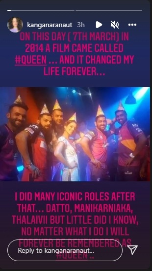 “आज याच दिवशी ७ मार्च २०१४ रोजी ‘क्वीन’ नावाचा एक चित्रपट प्रदर्शित झाला आणि त्यानंतर माझे आयुष्य कायमचे बदलून गेले. त्यानंतर मी अनेक चित्रपटात विविध भूमिका साकारल्या. ‘दत्तो’, ‘मणिकर्णिका’, ‘थलायवी’…पण मला काय माहित होते की मी यापुढे काहीही केलं तरी लोक कायम मला राणी (क्वीन) म्हणूनच लक्षात ठेवणार आहेत”, असे कंगना म्हणाली.