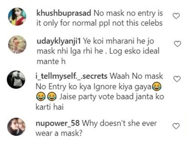या व्हिडीओवर कमेंट करत एक नेटकरी म्हणाला, “नो मास्क नो एण्ट्री एक फक्त सामान्यांसाठी आहे अशा सेलेब्ससाठी नाही”. तर दुसरा युजर म्हणाला, “ही कुणी महाराणी आहे का? मास्क न घालायला. लोक हिला आदर्श मानतात.” तर आणखी एक युजर म्हणाला, “व्वा नो मास्क नो एण्ट्रकडे काय दूर्लक्ष केलंय. जसं वोट मिळाल्यानंतर पक्ष जनतेला करते”