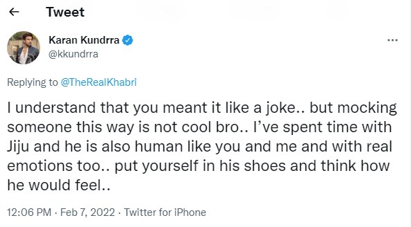 करणनं या युजरच्या ट्वीटला रिप्लाय करताना लिहिलं, ‘मला माहीत आहे तुम्ही हे असं त्यांची खिल्ली उडवण्यासाठी असं लिहिलं आहे. पण असं करणं चुकीचं आहे. मी त्यांच्यासोबत टाइम स्पेंड केला आहे. ते सुद्धा आपल्या सारखेच आहेत. त्यांना देखील भावना आहेत. एकदा त्यांच्या जागी स्वतःला ठेवून पाहा आणि मग सांगा तुम्हाला कसं वाटतं.’