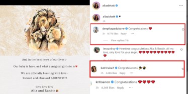 त्यावर सिनेसृष्टीतील अनेक कलाकार कमेंट करताना दिसत आहे. अभिनेत्री दीपिका पदुकोण हिने आलियाच्या या पोस्टवर कमेंट केली आहे. खूप खूप शुभेच्छा असे दीपिकाने कमेंट करताना म्हटले आहे. तर अभिनेत्री कतरिना कैफ हिने ही यावर कमेंट करत उत्तर दिले आहे. तिनेही त्यावर खूप शुभेच्छा अशी कमेंट केली आहे. त्या दोघींच्याही कमेंट सध्या व्हायरल होताना दिसत आहे.
