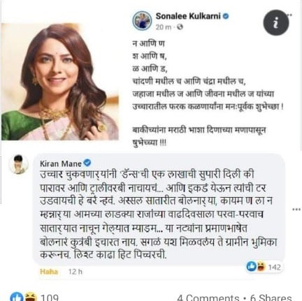 अभिनेता किरण माने काही दिवसांपूर्वी ‘मुलगी झाली हो’ मालिकेच्या सेटवर झालेल्या वादामुळे चर्चेत होते. त्यानंतर आता सोनालीच्या पोस्टवर कमेंट केल्यानंतर ते पुन्हा चर्चेत आले आहेत. सोनालीनं मराठी भाषा दिनाच्या शुभेच्छा देताना लिहिलं, ‘न आणि ण.. श आणि ष…ळ आणि ड, चांदणी मधील च आणि चंद्रामधील च, जहाजमधील ज आणि जीवनामधील ज यांच्या उच्चारातील फरक कळणाऱ्यांना मनःपूर्वक शुभेच्छा! बाकीच्यांना मराठी भाशा दिणाच्या मणापासून षुभेच्छा!!!’