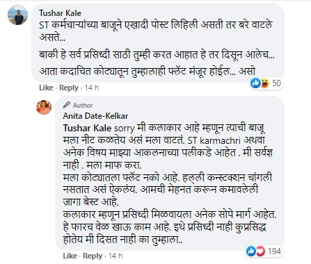 अनिता दाते या सोशल मीडियावर प्रचंड सक्रीय असते. तिने काही तासांपूर्वी लिहिलेल्या एका पोस्टवर अनेक नेटकऱ्यांनी कमेंट केल्या आहेत. नुकतंच एका नेटकऱ्याने एसटी कर्मचाऱ्यांवरुन तिला ट्रोल करण्याचा प्रयत्न केला आहे. यावर तिनेही सडेतोड उत्तर दिले आहे.