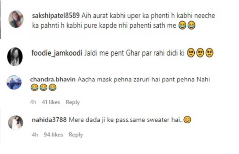 मलायकाचा हा लूक पाहिल्यानंतर नेटकऱ्यांनी तिला ट्रोल केले आहे. एक नेटकरी म्हणाला,”ताई, घाई-घाईत पॅंट घरीच विसरल्या.” दुसरा नेटकरी म्हणाला, “ही स्त्री कधी वरचे कपडे परिधान करते, तर कधी खालचे ती कधीच पूर्ण कपडे परिधान करत नाही.” तिसरा नेटकरी म्हणतो, “ओके, मास्क असणं गरजेच आहे पॅंट परिधान करण नाही.” आणखी एक नेटकरी म्हणाला, “माझ्या आजोबांकडेही असचं स्वेटर आहे.”