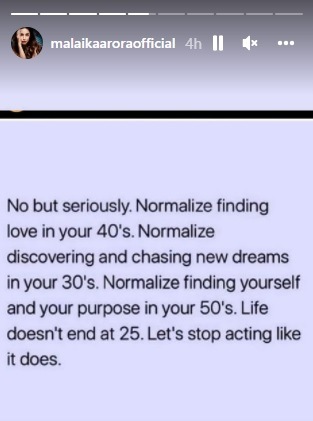 मलायका अरोरानं तिच्या इन्स्टाग्रामवर स्टोरीवर एक पोस्ट शेअर केली आहे. ज्यात तिनं अशाप्रकारच्या ब्रेकअपच्या चर्चांवर राग व्यक्त केला आहे. तिने लिहिलं, ‘जर तुम्हाला वयाच्या ४० वर्षी प्रेम मिळालं तर ही सामान्य गोष्ट आहे असं समजायला हवं. वयाच्या ३० वर्षी जर तुम्ही नवी स्वप्न पाहत असाल आणि ती पूर्ण करण्याची तयारी ठेवत असाल तर यात नवीन काहीच नाही आणि वयाच्या ५० व्या वर्षीही तुम्ही तुमच्या जीवनाचा उद्देश शोधू शकता. तुमचं आयुष्य २५ व्या वर्षी संपत नाही. त्यामुळे असं वागणं बंद करा आणि स्वतःचे विचार बदला.’