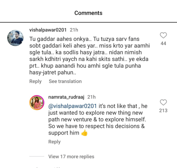 चाहत्याने केलेली कमेंट पाहून अखेर नम्रता संभेरावला मध्यस्थी करत ओंकार भोजनेची बाजू स्पष्ट करावी लागली. या युजरला उत्तर देत नम्रता म्हणाली, “प्रत्यक्षात असे काहीच नाही, त्याला नव्या गोष्टी शिकायच्या होत्या म्हणून त्याने त्याचा मार्ग निवडला. आम्ही सर्वांनी त्याच्या निर्णयाचा आदर करत त्याला सहकार्य केले.” अभिनेत्रीने मित्राची खंबीरपणे बाजू घेतल्यामुळे नेटकऱ्यांनी नम्रताचे कौतुक करत तिने दिलेल्या उत्तरावर सहमती दर्शवली.