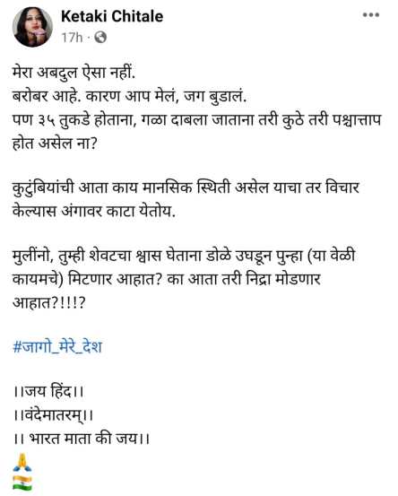 या प्रकरणावर सध्या सोशल मीडियावर चर्चा होत आहेत. सामान्य नागरिकांपासून ते सेलिब्रिटी यावर व्यक्त होत आहेत. अभिनेत्री केतकी चितळेने याबद्दलची पोस्ट फेसबुकवर शेअर केली आहे. या पोस्टमध्ये तिने “मेरा अब्दुल ऐसा नहीं. बरोबर आहे. कारण आप मेलं, जग बुडालं. पण ३५ तुकडे होताना, गळा दाबला जाताना तरी कुठे तरी पश्चात्ताप होत असेल ना? कुटुंबियांची आता काय मानसिक स्थिती असेल याचा तर विचार केल्यास अंगावर काटा येतोय. मुलींनो, तुम्ही शेवटचा श्वास घेताना डोळे उघडून पुन्हा (या वेळी कायमचे) मिटणार आहात? का आता तरी निद्रा मोडणार आहात?!!!? #जागोमेरेदेश” असे लिहिले आहे.