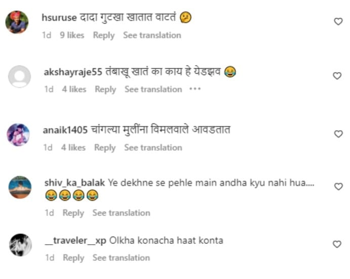 सईने हा फोटो शेअर करताना सिरीअल चिलर्स असे म्हटले आहे. त्यावरुन अनेक नेटकऱ्यांनी तिला आणि अनिशला ट्रोल केले आहे. यावर एक नेटकऱ्याने ‘दादा गुटखा खातात वाटत’ असे म्हटले आहे. ‘तंबाखू खातं का काय हे’, असा प्रश्न एकाने विचारला आहे. तर एकाने ‘चांगल्या मुलींना विमलवाले आवडतात’, असे म्हटले आहे. ‘हे पाहण्यापूर्वी मी आंधळा का झालो नाही’, अशी कमेंट एकाने केली आहे. तर एकाने ‘ये गुटखा खाणाऱ्या…’ असे म्हटले आहे.