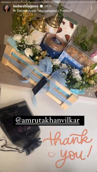 केदार शिंदे यांनी नुकताच त्यांच्या इंस्टाग्राम स्टोरीवर एक छोटासा व्हिडीओ पोस्ट केला. या व्हिडीओमधून त्यांनी अमृता खानविलकरने त्यांना पाठवलेल्या भेटवस्तूची झलक दाखवली. अमृताने केदार शिंदेंसाठी एक खास हॅम्पर पाठवलं. यामध्ये सुंदर फुलं, बिस्किट्स, चॉकलेट्स अशा विविध वस्तू आहेत. हा व्हिडीओ पोस्ट करत केदार शिंदे यांनी या भेटवस्तूबद्दल अमृताचे आभार मानले.