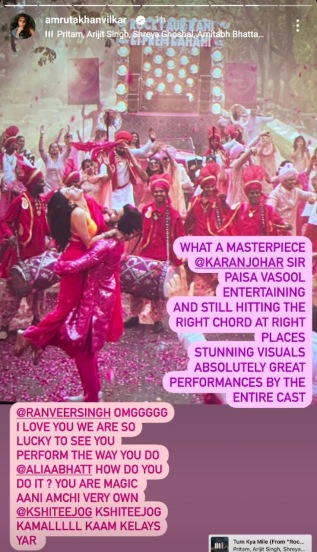 अमृता तिच्या पोस्टमध्ये लिहिते, “करण जोहर सर पैसा वसूल आणि मनोरंजन करणारा चित्रपट तुम्ही बनवला आहे. चित्रपटातील प्रत्येक कलाकाराने उत्तम काम केले आहे. रणवीर सिंह आणि आलिया भट्ट तुम्हा दोघांनाही भरभरून प्रेम! शेवटी आमच्या लाडक्या क्षिती जोगला सांगेन, अगं काय कमाल काम केलं आहेस यार…”
