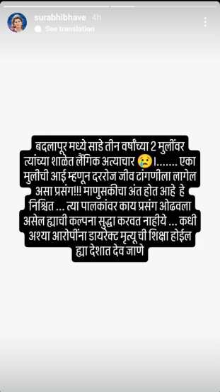 अभिनेत्री सुरभी भावेने लिहिलं आहे की, बदलापूरमध्ये साडे तीन वर्षांच्या दोन मुलींवर त्यांच्या शाळेत लैंगिक अत्याचार!…एका मुलीची आई म्हणून दररोज जीव टांगणीला लागेल असा प्रसंग…माणुसकीचा अंत होत आहे हे निश्चित…त्या पालकांवर काय प्रसंग ओढवला असे याची कल्पना सुद्धा करवत नाहीये…कधी अशा आरोपींना थेट मृत्यू शिक्षा होईल देव जाणे.