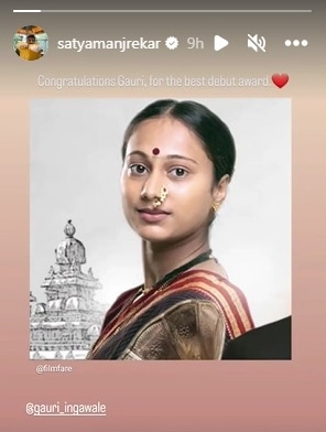 सत्याने ‘पांघरुण’ या चित्रपटाच्या पोस्टरचा एक फोटो शेअर केला आहे. त्याबरोबर त्याने त्याला कॅप्शन देत तिला शुभेच्छा दिल्या आहेत. “गौरी तुला फिल्मफेअरचा सर्वोत्कृष्ट पदार्पणासाठीचा अॅवॉर्ड मिळाला, त्याबद्दल तुझे खूप कौतुक”, असे सत्याने म्हटले आहे.