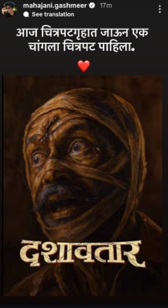 आता अभिनेता गश्मीर महाजनीने दशावतार चित्रपट पाहिल्यानंतर त्याच्या भावना व्यक्त केल्या आहेत. अभिनेत्याने सोशल मीडियावर दशावतारचे एक पोस्टर शेअर करत लिहिले, “आज चित्रपटगृहात जाऊन एक चांगला चित्रपट पाहिला”, असे कॅप्शन दिले आहे. तसेच पुढे हार्ट इमोजी देखील शेअर केली आहे.