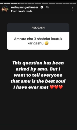 गश्मीर महाजनीने त्याच्या इन्स्टाग्राम अकाउंटवर प्रश्न-उत्तरे हा सेशन घेतला. यामध्ये चाहत्यांनी विचारलेल्या प्रश्नांची गश्मीरने उत्तरे दिली आहेत. अनेक चाहत्यांनी त्याच्या नवीन गाण्याचे कौतुक केले. अनेकांनी तो उत्तम अभिनेता असल्याचे म्हटले, तर काहींनी त्याला त्याच्या आगामी चित्रपटाविषयी विचारले. एका चाहत्याने ‘फौजदार’साठी कास्टिंग झाली का, अभिनेत्रीची निवड झाली का असेही विचारले. एका चाहत्याने अमृताचे तीन शब्दात कौतुक करण्यास सांगितले. त्यावर बोलताना अभिनेत्याने म्हटले, “अमृतानेदेखील असाच प्रश्न विचारला होता. पण, मला सगळ्यांना हे सांगायचे आहे की अमृता मला आतापर्यंत भेटलेली सर्वोत्तम व्यक्ती आहे”, असे म्हणत अभिनेत्याने अमृता खानविलकरचे कौतुक केले आहे.