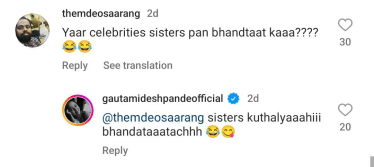 मृण्मयी आणि गौतमीच्या भांडणाचा मजेशीर व्हिडीओ पाहून अनेक कलाकरांनी यावर प्रतिक्रिया दिल्या आहेत. एका युजरने गौतमीला टॅग करत, “सेलिब्रिटी बहिणींची भांडणं होतात का?” असा प्रश्न विचारला होता. यावर उत्तर देताना गौतमी लिहिते, “कोणत्याही बहिणी भांडतातचं…” तिने शेअर केलेल्या व्हिडीओवर अमृता खानविलकर, अन्विता फलटणकर, रेशम या अभिनेत्रींनी कमेंट्स केल्या आहेत.