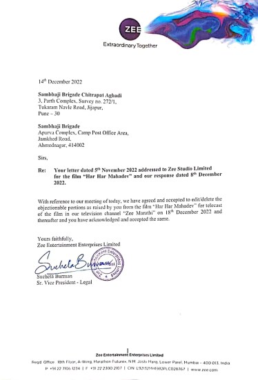 “आज आपण बैठकीत चर्चा केल्याप्रमाणे ‘हर हर महादेव’ या चित्रपटातील काही वादग्रस्त दृश्य आणि प्रसंग वगळण्याचा किंवा ते हटवण्याचा निर्णय घेतला आहे. हे दृश्य हटवल्यानंतरच येत्या १८ डिसेंबर २०२२ रोजी हा चित्रपट झी मराठी वाहिनीवर प्रक्षेपित केला जाईल, याची नोंद घ्यावी”, असे या पत्रात म्हटले आहे.