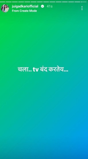 ‘ठरलं तर मग’ फेम अभिनेत्री जुई गडकरी हिने टीव्ही बंद केल्याची स्टोरी इन्स्टाग्रामवर शेअर केला आहे. “चला…टीव्ही बंद करतेय”, असं तिने लिहीलं आहे. तसेच याआधी स्टोरीमध्ये जुईने प्रत्येक ओव्हरला ऑस्ट्रेलियाची एक विकेट जावी अशी इच्छा व्यक्त केली होती.