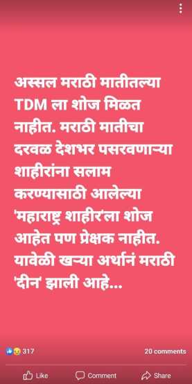 त्यांनी त्यांच्या फेसबुक अकाऊंटवर एक पोस्ट शेअर करीत लिहिले, “अस्सल मराठी मातीतल्या ‘TDM’ला शोज मिळत नाहीत. मराठी मातीचा दरवळ देशभर पसरवणाऱ्या शाहीरांना सलाम करण्यासाठी आलेल्या ‘महाराष्ट्र शाहीर’ला शोज आहेत पण प्रेक्षक नाहीत. या वेळी खऱ्या अर्थाने मराठी ‘दीन’ झाली आहे.”