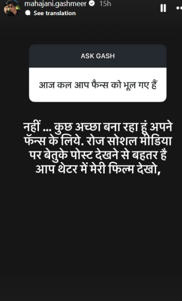 एक चाहता गश्मीरला म्हणाला की, तू तुझ्या चाहत्यांना विसरला आहेस. त्यावर गश्मीरने उत्तर देत लिहिले, “नाही. मी माझ्या चाहत्यांना विसरलेलो नाही. मी माझ्या चाहत्यांसाठी काहीतरी खास बनवत आहे. सोशल मीडियावर रोज बिनअर्थाच्या पोस्ट बघण्यापेक्षा चित्रपटगृहात तुम्ही माझा चित्रपट पाहा. चाहते गश्मीरला अनेकविध प्रश्न विचारताना दिसतात आणि गश्मीरदेखील त्याची उत्तरे देत असतो.