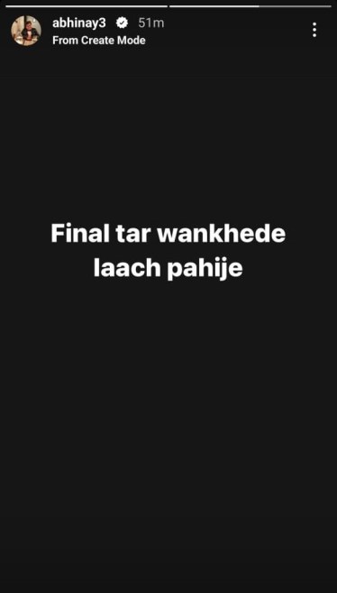 अभिनेता अभिनय बेर्डे आणि अभिनेत्री अन्विता फलटणकर यांनी अंतिम सामना वानखेडेलाच झाला पाहिजे असं मत व्यक्त केलं. दोघांनी या आशयाची इन्स्टाग्रामला स्टोरी शेअर केली आहे; जी चांगलीच चर्चेत आली आहे.