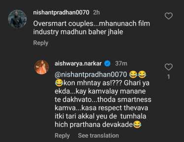 या व्हिडीओवरील प्रतिक्रियेत एका नेटकऱ्यानं लिहीलं आहे की, अतिहुशार जोडपं…म्हणूनच सिनेसृष्टीमधून बाहेर झालं. या प्रतिक्रियेवर ऐश्वर्या नारकर यांनी सडेतोड प्रत्युत्तर दिलं आहे. त्यांनी हा नेटकऱ्याला टॅग करत लिहीलं, “कोण म्हणतंय असं? घरी या एकदा…काय कमवलंय ते दाखवतो…थोडा स्मार्टनेस कमवा…कसा आदर ठेवावा इतकी तरी अक्कल येऊ दे तुम्हाला हीच प्रार्थना देवाकडे…”