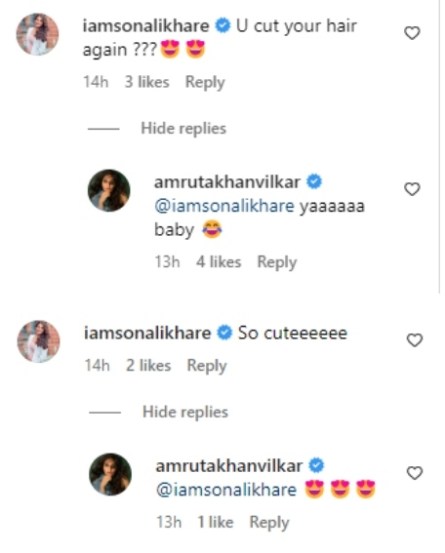अमृता केस कापल्याचा फोटो शेअर केल्यावर त्यावर अनेक कलाकारांनी प्रतिक्रिया दिली आहे. अभिनेत्री सोनाली खरे हिने अमृताचा नवा लूक पाहून त्यावर कमेंट केली आहे. ‘तू पुन्हा तुझे केस कापलेस’, अशी कमेंट सोनालीने केली आहे. त्यावर अमृताने ‘हो, बेबी’ असं म्हणतं हसण्याचे इमोजी पोस्ट केले आहेत.