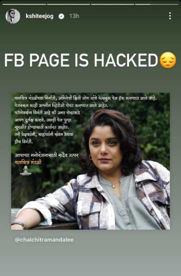 इन्स्टाग्राम स्टोरीवर क्षिती जोगनं एक फोटो पोस्ट करून फेसबुक पेज हॅक झाल्याचं सांगितलं आहे. तसेच त्या फोटोमधून तिनं चाहत्यांना एक विनंती केली आहे. या फोटोमध्ये लिहिण्यात आलं आहे की, “चलचित्र मंडळीची निर्माती, अभिनेत्री क्षिती जोश यांचं फेसबुक पेज हॅक करण्यात आलं आहे. पेजवरून काही अश्लील व्हिडीओ पोस्ट करण्यात आले आहेत. फॉलोवर्सना विनंती आहे की, अशा पोस्टकडे आपण दुर्लक्ष करावं. आम्ही पेज पुन्हा सुरळीत होण्यासाठी कार्यरत आहोत. तरी प्रेक्षकांनी, चाहत्यांनी संयम ठेवावा, हीच विनंती. आपल्या मनोरंजनासाठी सदैव तत्पर चलचित्र मंडळी.”