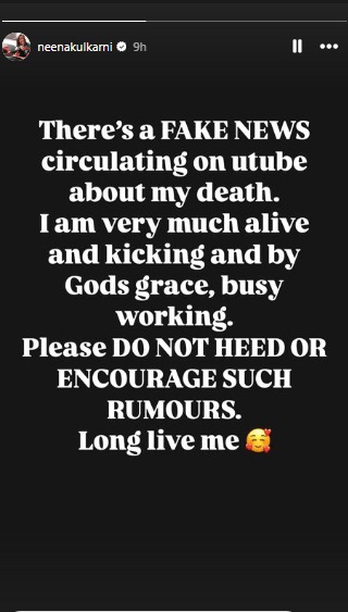ज्येष्ठ अभिनेत्री नीना कुळकर्णी यांनी निधनाच्या माहितीचे खंडन करत इन्स्टाग्रामवर स्टोरी शेअर करीत लिहिले, “माझ्या निधनाची एक खोटी बातमी यूट्यूबवर पसरत आहे. मी जिवंत असून स्वस्थ आहे. देवाच्या कृपेने कामात व्यग्र आहे. कृपया अशा अफवांना प्रोत्साहन देऊ नका किंवा त्याकडे दुर्लक्ष करा. मला दीर्घायुष्य मिळो.”