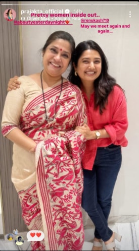 हा फोटो शेअर करीत प्राजक्ता माळीने लिहिले, “आतून आणि बाहेरून सुंदर असलेली स्त्री”, पुढे तिने रेणुका शहाणे यांना टॅग करत लिहिले, “आपण सतत भेटत राहिले पाहिजे”, असे लिहीत तिने तिच्या भावना व्यक्त केल्या. प्राजक्ताची ही इन्स्टाग्राम स्टोरी रेणुका शहाणे यांनी रिपोस्ट करीत इमोजी शेअर करीत प्रेम व्यक्त केले.