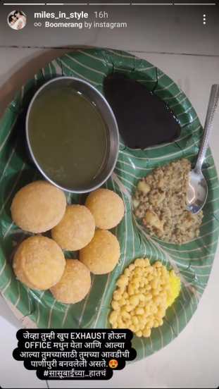 क्षितिजाने इन्स्टाग्राम स्टोरीवर सासूबाईंनी बनवलेल्या पाणीपुरीचा फोटो शेअर केला होता. या फोटोवर तिने लिहिलं होतं, “जेव्हा तुम्ही खूप थकून ऑफिसमधून येता आणि आल्या आल्या तुमच्यासाठी तुमच्या आवडीची पाणीपुरी बनवलेली असते. #सासूबाईंच्या हातचं.”
