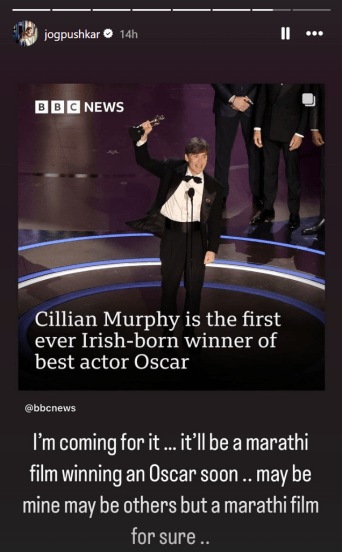 या सोहळ्यात अनेक कलाकारांना मनोरंजनसृष्टीतील कामगिरीसाठी ऑस्कर पुरस्काराने गौरविण्यात येते. या वर्षी ‘ओपेनहायमर’ चित्रपटामधील नायकाची भूमिका साकारणाऱ्या सिलियन मर्फीला सर्वोत्कृष्ट अभिनेत्याचा पुरस्कार मिळाला. सर्वोत्कृष्ट अभिनेत्याचा ऑस्कर पुरस्कार जिंकणारा सिलियन मर्फी हा पहिला आयरिश अभिनेता आहे. सिलियनच्या या बातमीची पोस्ट नुकतीच पुष्कर जोगने आपल्या अधिकृत इन्स्टाग्राम स्टोरीवर शेअर केली आणि त्याला कॅप्शन देत पुष्करने लिहिले, “मीही त्याच वाटेवर चालतोय. लवकरच मराठी चित्रपटही ऑस्कर जिंकेल. कदाचित तो चित्रपट माझा असेल किंवा दुसऱ्या कोणाचाही असेल; पण मराठी चित्रपट लवकरच ऑस्कर जिंकेल.”